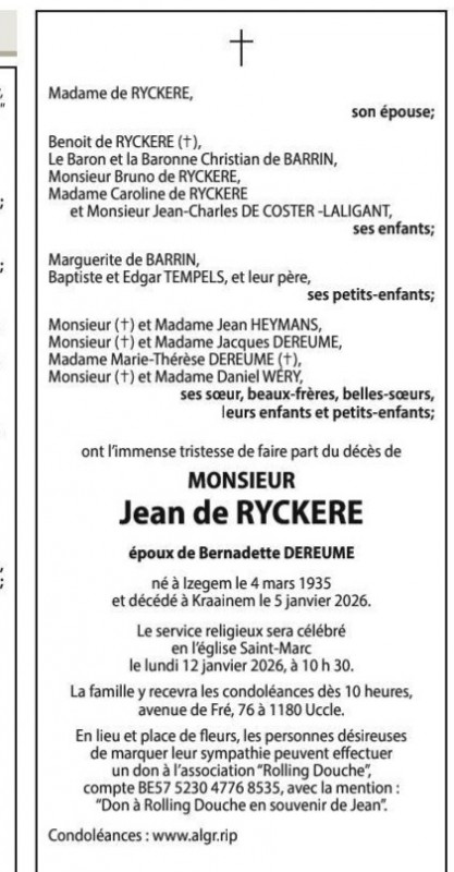 Comme annoncé dans notre dernier message, vous trouverez en annexe l'avis nécrologique du décès de notre cher Président Jean de Ryckere.